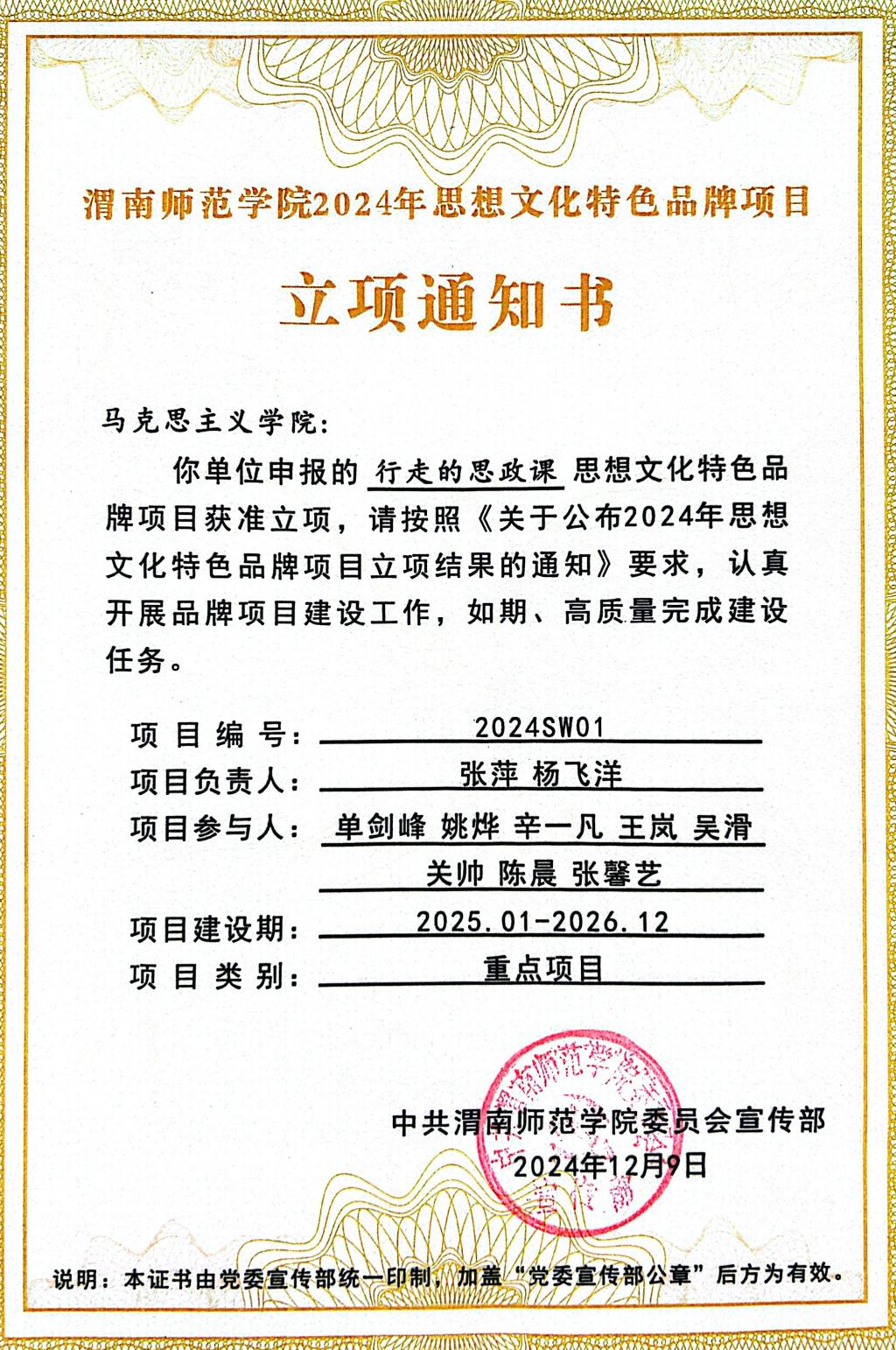 今日收到的公司党委宣传部文件《关于设立2024年思想文化特色品牌项目的通知》显示,公司思政课教学实践“行走的思政课”经公司申报、公司组织专家评审,被公司确定为2024年重点特色思想文化特色品牌建设项目,项目建设期自2025年1月起共两年,资助经费2000元。