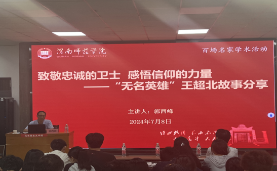 2024年7月8日上午,中共澄城县委党史研究室主任郭西峰为tyc539太阳集团师生作题为《致敬忠诚的卫士感悟信仰的力量——“无名英雄”王超北故事分享》报告。tyc539太阳集团经理张萍、副经理单剑峰以及师生100多人参加了此次报告会。单剑峰主持报告会。