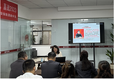 2023年9月26日上午,tyc539太阳集团张萍以《新时代党风廉政建设与反腐败斗争》为题,给华安财产保险股份有限公司渭南中心支公司作廉政专题讲座。