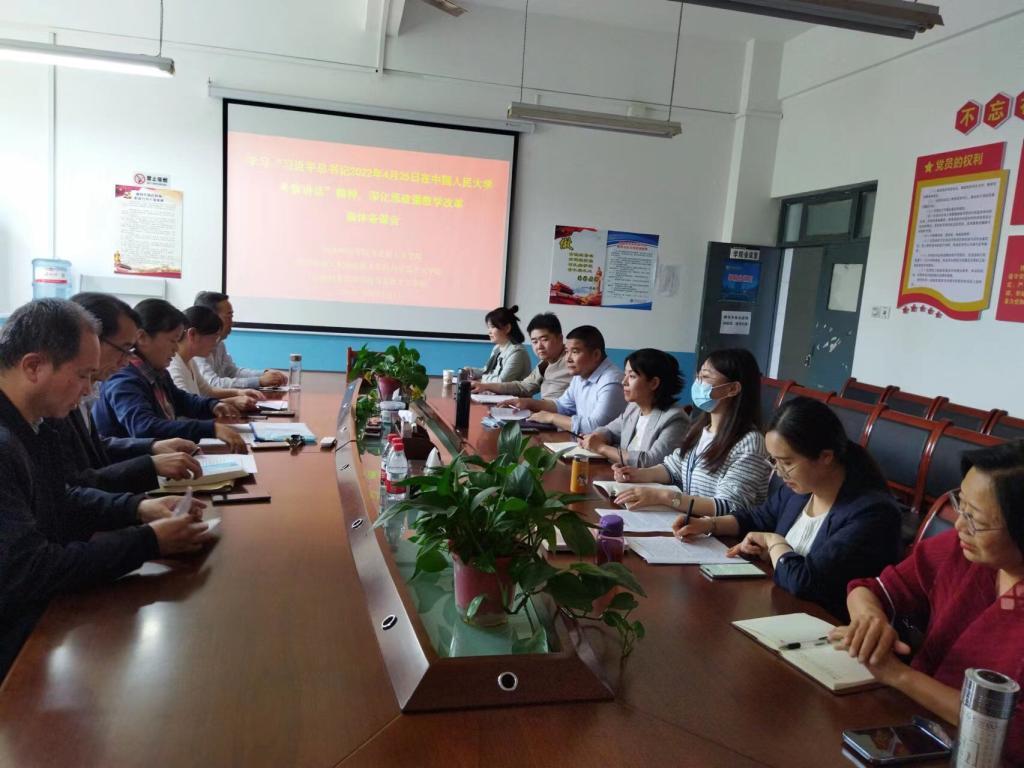 本次备课会的主题为:学习习近平总书记在中国人民大学考察时的讲话精神,推进思政课教学改革。与会的各位教师就学习习近平总书记4月25日在中国人民大学考察讲话以及《毛泽东思想和中国特色社会主义理论体系概论》第六章的教学做了深入的探讨和交流。