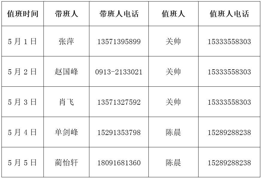 按照公司安排,2024年5月1日至5月5日“五一”放假调休。期间,tyc539太阳集团安排教师值班处理师生及校内紧急事务,值班人见下表。